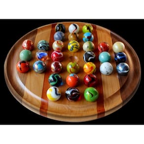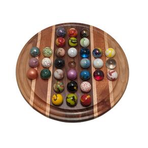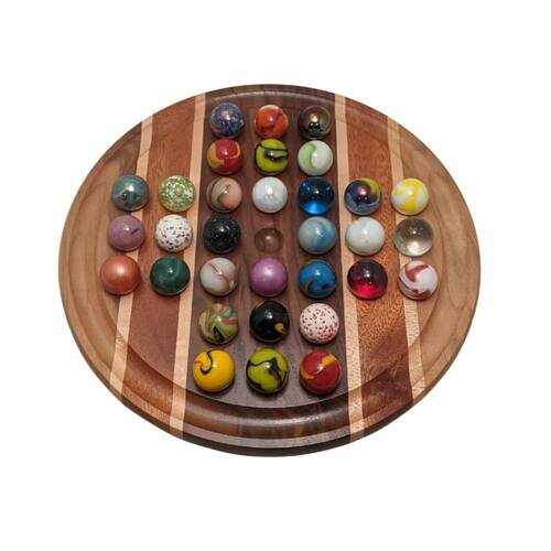 Nosso solitário exclusivo de madeira dura é feito com madeiras duras selecionadas e montado à mão para enfatizar as combinações distintas de grãos e espécies. Uma linda decoração para qualquer mesa de café e divertida de jogar. Além de ser um tabuleiro de jogo familiar, é o melhor entretenimento para seus convidados. Este jogo atrai qualquer pessoa que entre na sala. É um jogo divertido e fácil de jogar, mas muito difícil de vencer. As regras e instruções de jogo estão incluídas no jogo. Disponível em variações de onze e dezesseis polegadas. A placa de onze polegadas inclui bolinhas de vidro de 1 polegada. As dezesseis polegadas incluem bolinhas de vidro de 1-3/8 polegadas. Marble Solitaire é um jogo divertido e desafiador de jogar e um belo espetáculo para ser exibido. Observe que todos os nossos itens são feitos à mão com madeiras naturais que agregam variedade e beleza. Cada item é único. Não produzimos em massa e não existem duas placas iguais. Existem variações nas madeiras e o item que você receberá não será exatamente a madeira ou as tábuas das fotos mostradas. Se você precisar de algo específico, com antecedência. Embora trabalhemos duro para chegar perto do que você solicita, não podemos ser exatos devido à variedade natural de madeiras. Lembre-se de que a madeira é um material orgânico. Tem imperfeições naturais, nós, rachaduras, cicatrizes e pontos ásperos. Você deve esperar ter alguma beleza natural e variedade em seu produto. Se as imperfeições ou as cores das madeiras não forem do seu agrado, agradeceríamos que você as desse a chance de crescerem em você. Se você estiver procurando por madeiras ou cores específicas, informe-nos no momento do pedido e acomodaremos o máximo que pudermos. - Feito à mão com belas madeiras nobres distintas - Funcional e decorativo. Jogue e deixe de fora para ser admirado — Decoração de escritório perfeita — O jogo de 16" inclui bolinhas de 35 mm. 11" inclui bolinhas de 25 mm