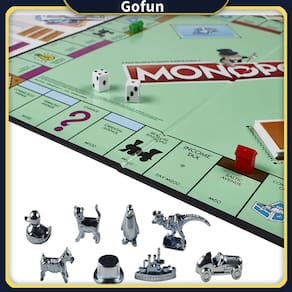 baús comunitários, 32 casas, 12 hotéis, 2 dados, pacote de dinheiro e guia do jogo