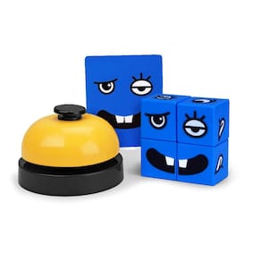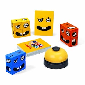 Vire a primeira carta, combine os cubos para formar a carinha sorteada e toque a campainha. Quem fizer isso mais rápido, vence a rodada.