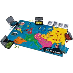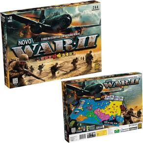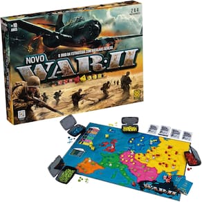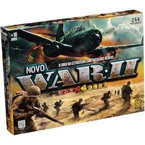 Descrição do produto : " No novo War II as grandes batalhas serão travadas agora no continente europeu. Com novas regras, o jogo será mais intenso e dinâmico!\nVibre desenvolvendo estratégias para conquistar diferentes regiões e vença os exércitos inimigos em lances eletrizantes, que vão contar com todo seu raciocínio e... só com um pouco de sorte.\nCada jogador terá três miniaturas de aviões que sobrevoam o campo de batalha e dão vantagens durante os combates. Utilize de forma estratégica seus aviões aumentando suas chances de vitória com o dado de oito lados para conquistar novos territórios ou proteger fronteiras importantes.\nExperimente a incrível sensação de comandar uma força aérea com seu exército, conquistando grandes vitórias como um verdadeiro general!\nA partir de 10 anos Participantes : 2 a 4 1 tabuleiro, 1 baralho, 4 estojos plásticos, 4 conjuntos de exércitos, 12 aviões, 12 bases para aviões, 3 dados vermelhos, 3 dados amarelos, 1 dado vermelho de 8 lados, 1 dado amarelo de 8 lados, 1 regra para jogo individual e 1 regra para jogo em duplas. : "
