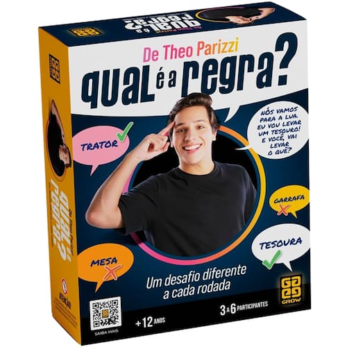 Descrição do produto : “Qual é a Regra?" desafia os jogadores a explorarem suas habilidades de dedução em uma atividade dinâmica e surpreendente. O jogo é inspirado na brincadeira criativa do influencer Theo Parizzi com sua família, na qual ele dá dicas através de palavras ou ações. Enquanto isso, os familiares tentam ganhar pontos descobrindo a característica comum entre as dicas ou a regra por trás delas. Em cada rodada do jogo, os participantes devem decifrar a regra específica da carta para avançar no tabuleiro. Com 100 regras diferentes, cada uma garantindo uma nova experiência, "Qual é a Regra?" promete muita diversão a cada rodada! Eu vou à Lua e vou levar um leão! Você não poderia levar um cachorro, mas poderia levar uma zebra! E aí, já sabe qual é a regra? :