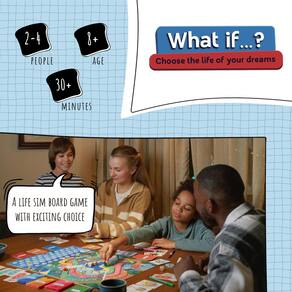 A vida é uma bela aventura com tantos cenários, e em "What if...? ", você pode experimentar alguns deles para ver quais farão seu personagem mais feliz! "E se...? Choose the life of your dreams" é um simulador de vida de jogo de tabuleiro onde seu personagem pode experimentar vários estilos de vida, como ser um aventureiro, empreendedor ou carreirista. Os jogadores se moverão pelo tabuleiro escolhendo um dos números lançados nos dados — dessa forma, eles serão capazes de planejar seus movimentos — e realizar ações que mudam vidas. Seus personagens podem encontrar o amor, obter uma ou rebaixamento, adotar um animal de estimação e até mesmo comprar um lugar para chamar de lar. Você pode ganhar ou perder dinheiro, mas afinal, para ganhar o jogo, seu personagem deve ser o mais feliz — o objetivo é ser o primeiro a alcançar 50 pontos de felicidade. Este jogo de tabuleiro colorido e fascinante é a escolha perfeita para crianças e famílias! - Jogo de tabuleiro SIM LIFE: torne-se um carreirista, aventureiro ou empreendedor e experimente uma infinidade de cenários de vida: compre uma casa, case, tenha filhos, adote animais de estimação, lute contra gangues de guaxinins e muito mais. Tudo para se tornar o jogador mais feliz! - ARTE E DESIGN VIBRANTES: Como a própria vida, "E se...?" é uma aventura colorida! Ao jogar este jogo, você definitivamente vai querer ter um momento para admirar uma ilustração maravilhosa do seu novo animal de estimação ou de uma casa que você acabou de comprar. - Fácil de aprender: as regras são simples e fáceis de lembrar, o que torna este jogo a escolha perfeita para crianças. - Dois modos para jogar mais: o modo avançado do jogo introduz várias mudanças simples, mas importantes, oferecendo a você escolhas ainda mais emocionantes para fazer. - 🔥 Número de jogadores e tempo médio de jogo: este jogo de tabuleiro colorido é uma escolha perfeita para famílias e crianças e pode ser jogado com 2 a 4 jogadores com 8 anos ou mais. O tempo médio de diversão é de 30 a 60 minutos.
