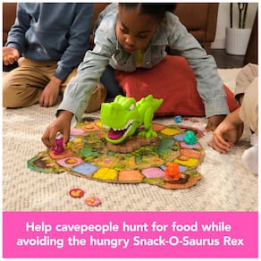 Spin Master Games, jogo de tabuleiro Snack-O-Saurus Rex para fãs de dinossauros, jogo infantil, jogo divertido para família, jogo de tabuleiro para uma noite de jogos em família, para maiores de 5 anos - FUJA DA LÍNGUA DOS DINOSSAUROS: ajude pessoas famintas das cavernas a caçar comida enquanto se esquiva do lendário Snack-O-Saurus Rex. Pegue um lanche ou relaxe neste jogo muito divertido! - CAÇA E COLETE DIVERSÃO: reúna de 2 a 4 jogadores com mais de 5 anos que adoram lanches, aventuras na selva e evitar línguas de dinossauros para coletar petiscos deliciosos, como o saboroso taco-dáctilo e a pizza pré-histórica, ao longo do caminho. - PACOTE DE LANCHES: Colete dois pares de lanches para ganhar! Cuidado: o dinossauro que adora comida pegará lanches extras quando você soltar sua língua super longa. Mire o dinossauro no lanche para pegar uma guloseima ou mire em um oponente para mandá-lo de volta! - SPIN MASTER: Precisa de presentes para fãs de brinquedos de dinossauros, lanches para crianças e jogos divertidos? Compre jogos e brinquedos, como brinquedos de dinossauro para crianças de 5 a 7 anos, jogos de tabuleiro para crianças de 8 a 12 anos e presente de aniversário para meninas de 6 anos. - JOGOS DE TABULEIRO PARA A NOITE EM FAMÍLIA: Traga mais do que fichas para a noite de jogos em família com um de nossos jogos de tabuleiro familiares, jogos familiares, jogos de estratégia, jogos para adultos, jogos divertidos de festa ou jogos de tabuleiro para crianças de 4 a 6 anos. - Inclui 1 Snack-O-Saurus Rex (dinossauro e pés), 1 base, 1 conector de base, 1 tabuleiro de jogo, 20 lanches (4 de cada tipo), 4 pessoas da caverna, 1 dado, folha de instruções — coberta pelo compromisso da Spin Master Care. Veja abaixo os detalhes completos