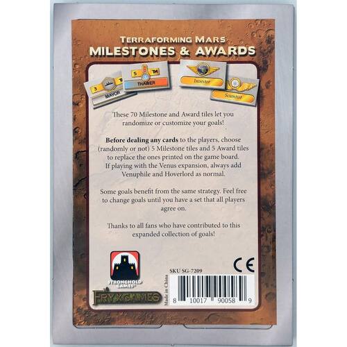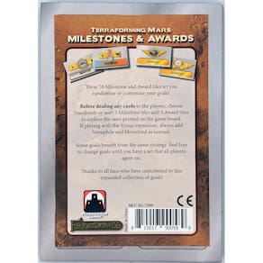 Stronghold Games Terraforming Mars Milestones and Awards - Jogo de tabuleiro de estratégia - para 1 a 5 jogadores e maiores de 12 anos - Novos marcos: alcançar objetivos significativos como "Terraformer" e "Gardener", recompensando o planejamento estratégico e o gerenciamento de recursos. - Prêmios dinâmicos: competir por vários prêmios com base em suas contribuições para o desenvolvimento de Marte, incluindo o "Best Builder" e "Best Terraformer" - Jogabilidade aprimorada: adicione novas camadas de competição e emoção enquanto você se esforça para ofuscar seus oponentes enquanto avança no ambiente de Marte.