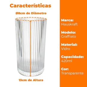 Os Copos, Taças e Jarra Graffiato da Hauskraft são produzidos em vidro, com desenhos em relevo listrados para você servir deliciosas bebidas com mais praticidade e requinte. Seu design minimalista, atemporal e elegante permite composições com outros itens em sua mesa ou cristaleira.