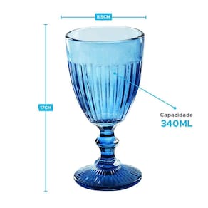 - Capacidade de 340ml, perfeitas para drinks, água, suco e refrigerante. - Dimensões: 8,5 x 17cm diâmetro x altura . - Taças de vidro de alta qualidade. - Lindo detalhe externo com relevo canelado.