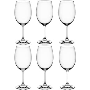 Garantia: 90 Dias / Peso: 1,080kg / Cor: Transparente / Ref: 56313104X6 Dimensões: 7,5cm (C) x 7,5cm (L) x 21cm (A) Diâmetro superior da taça: 6,2cm Diâmetro da base da taça: 7,5cm Espessura: 2mm Capacidade: 450ml Cuidados: - Manuseie com cuidado, evitando impactos; - Para prolongar a beleza de suas taças, lave-os com esponja macia e sabão ou detergente neutro. Enxágue bem com água morna e seque em seguida com um pano macio sem deixar fiapos; - Não use produtos abrasivos como palha de aço, pois eles podem riscar e danificar as taças. Ao lavar, separe as taças de outras louças como: pratos, panelas e talheres; - Nunca armazene as taças com o bojo virado para baixo, em contato com a superfície, exceto se estiverem em um rack com base ventilada. Caso contrário, corre-se o risco de acúmulo de odores nas taças; - Pode ir à lava-louças. Conteúdo: 6 taças de vinho tinto