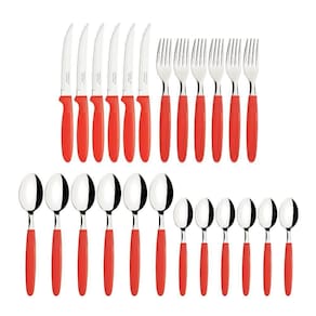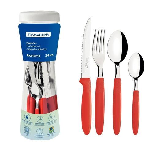 Tipo de embalagem: Pote | Material do cabo: Plástico | Modelo detalhado: Ipanema | Marca: Tramontina | Modelo: Ipanema | Material da lâmina: Aço Inox | Fonte do produto: Tramontina | Linha: Ipanema | Unidades por kit: 24 | É kit: Não | Talheres incluídos: Garfo, Faca, Colher e Colher de Chá | Quantidade de peças: 24 Peças | Condição do item: Novo | É apto para lava-louças: Sim | É kit de fábrica: Sim | Regulamentação Produto Perigoso: Não Aplicável Cor: Vermelho