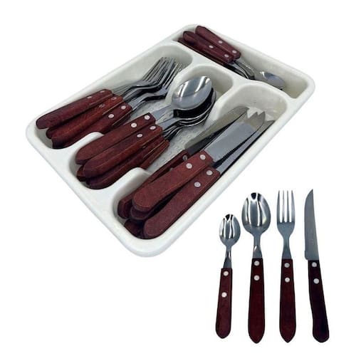 Especificações: - Material: Madeira e Inox - Medida Porta Talher: 21cm x 29cm - Medida Colher de Mesa: 15cm cada - Medida Colher de Sobremesa: 19cm cada - Medida Garfo de Mesa: 19cm cada - Medida Faca de Churrasco: 21cm cada - Porta Talher com Divisórias ===================================== Devido à diferença entre monitores e iluminação diferentes, pode haver variação na tonalidade apresentada no anúncio. Medidas muito aproximadas. Marca: Não Informado