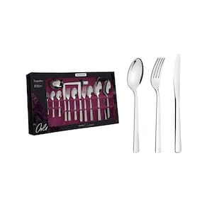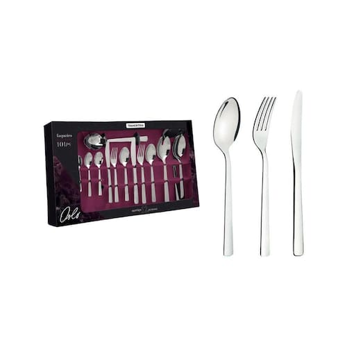 - 12 Colheres de Mesa; - 12 Garfos de Mesa; - 12 Facas de Mesa; - 12 Colheres para Sobremesa; - 12 Garfos para Sobremesa; - 12 Facas para Sobremesa; - 12 Colheres de Chá; - 12 Colheres de Café; - 1 Concha Terrina; - 1 Colher para Arroz; - 1 Colher para Açúcar; - 1 Colher para Salada; - 1 Garfo para Salada.