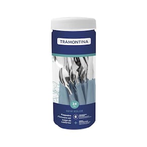 Jogo de Talheres 24 Peças Tramontina New Kolor 23198693 Azul - Características Gerais do Produto: Material: Aço Inox e Polipropileno Linha: New Kolor Pegador / Cabo: Polipropileno Pode ir à Maquina de Lavar Louças: Sim Tratamento do Talher: Facas com tratamento térmico Acompanha o produto: 6 Colheres de Mesa 6 Colheres para Chá 6 Facas para Churrasco 4 6 Garfos de Mesa 1 Pote Plástico : 90 dias junto ao fabricante Marca: Não Informado