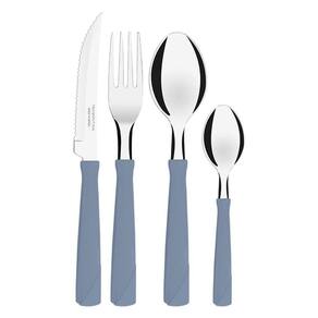 Jogo de Talheres 24 Peças Tramontina New Kolor 23198693 Azul - Características Gerais do Produto: Material: Aço Inox e Polipropileno Linha: New Kolor Pegador / Cabo: Polipropileno Pode ir à Maquina de Lavar Louças: Sim Tratamento do Talher: Facas com tratamento térmico Acompanha o produto: 6 Colheres de Mesa 6 Colheres para Chá 6 Facas para Churrasco 4 6 Garfos de Mesa 1 Pote Plástico : 90 dias junto ao fabricante Marca: Não Informado