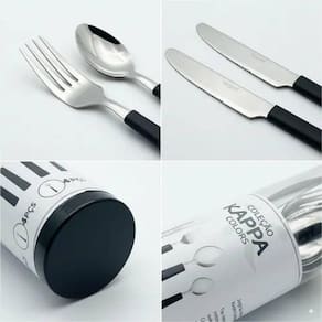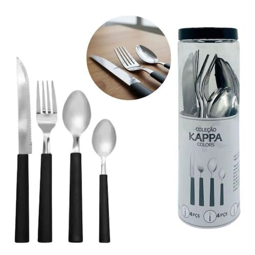 Conteúdo da embalagem: 04 facas, 04 garfos, 04 colheres de mesa, 04 colheres de sobremesa