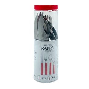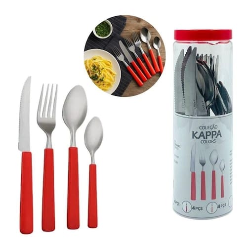 Jogo de Talheres Cabo Vermelho 16 Peças 04 Facas 04 Garfos 04 Colheres de Mesa 04 de Sobremesa Aço Inox
