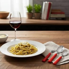 Cabos em plástico vermelho: acabamento colorido que deixa a mesa mais vibrante e descontraída.