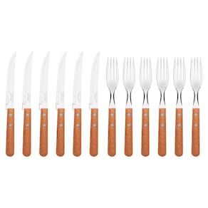 São 36 peças produzidas com cabo de madeira natural e rebites de alumínio, as lâminas das peças são em aço inox e possuem características que as tornam a melhor escolha para servir à mesa.