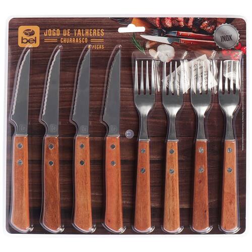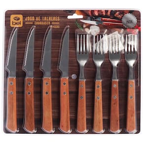 Conjunto de Talheres para Churrasco Bel – Praticidade e Elegância à Mesa! O Conjunto de Talheres para Churrasco Bel foi pensado para tornar seus momentos à mesa ainda mais especiais, seja no churrasco de domingo ou em refeições do dia a dia. Com design rústico e funcional, une durabilidade e conforto em cada detalhe. O conjunto inclui: 4 facas em aço inoxidável com cabo anatômico de madeira – cortes firmes e precisos Dimensões: 22,1 x 2,2 x 1,5cm 4 garfos em aço inoxidável com cabo anatômico de madeira – praticidade e estilo na hora de servir Dimensões: 20,5 x 2 x 1,2cm Dica de uso: Para garantir a durabilidade e beleza das peças, seque bem após a lavagem – inclusive se utilizar a lava louças. Funcionalidade, resistência e um toque de sofisticação em cada refeição. Aposte no Conjunto de Talheres Bel!