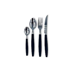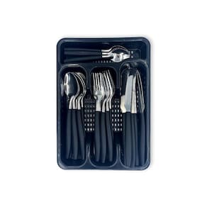 Jogo De Talheres Faqueiro Aço Inox Com Gaveteiro - Preto Junto com as 24 peças de talheres que são compostos por 6 facas, 6 garfos, 6 colheres e 6 colheres de chá, o nosso jogo vem com um porta talher de gaveta que além de manter sua gaveta ou balcão organizado também é versátil ao servir como um escorredor dos talheres, um jogo completo. Suas dimensões são: Facas: Comprimento 22,2 cmGarfo: Comprimento 20,1 cmColher De Mesa: Comprimento 19,5 cmColher De Sobremesa: Comprimento 15 cm Marca: FULLCOMMERCE
