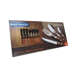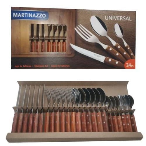 Jogo De Talheres Faqueiro Inox Com Cabo De Madeira 24 PeçasCom esse Jogo de talheres Martinazzo você equipa a sua cozinha com produtos de excelente qualidade, alta durabilidade e design estiloso.Sua mesa ficará muito elegante e charmosa. Além disso, todos os componentes do conjunto são feitos em material resistente, perfeitos para sua cozinha e sua mesa.O Faqueiro inox 24 peça Universal é prático e de fácil manuseio, conferindo resistência e facilitando na sua limpeza.O corte é garantido pelo tratamento térmico aplicado às lâminas, que garante durabilidade no fio de corte e maior resistência à corrosão.Sua espessura mesmo com uso intenso se mantém inalterada, tendo alta resistência e durabilidade.Seu charme é dado pelo seu cabo rústico de madeira, finalizado com rebites de alumínio.Informações Gerais:Material em aço inox e Cabo de Madeira.Dimensão Aproximada:Garfo: 19x2,5x2,1 Espessura: 1mmFaca: 21x2x1 Espessura: 1,2mmColher: 19x4x2,5 Espessura: 1,2mmColherinha: 15x2,8x1,5 Espessura: 1,2mmRecomendações de Uso:Use apenas água, sabão ou detergente e uma esponja macia.Produtos como palha de aço não são recomendados, pois poderão riscar ou prejudicar o brilho dos talheres.Após a Lavagem enxágue bem cada peça e as sequem bem.COMPOSIÇÃO06 Colheres de Mesa06 Garfos de Mesa06 Facas de Messa06 Colher Sobremesa