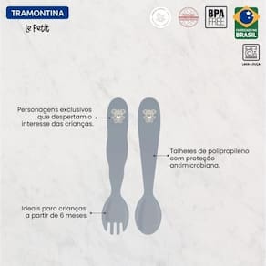 Jogo De Talheres Infantil Tramontina Le Petit 2 Peças Cinza Com jogo de talheres Infantil Tramontina Le Petit cinza 02 peças seu bebê terá uma refeição muito mais agradável e segura. Composto por talheres produzidos em polipropileno, o jogo conta com proteção antimicrobiana que inibe o crescimento de fungos e bacterias durante toda sua vida util e garante uma refeição supersegura! Recomendações de Uso: Recomenda-se o uso destes produtos para crianças com 6 meses ou da primeira utilização, lave bem as peças e produtos podem ir à máquina de lavar, porém não recomendamos usar produtos abrasivos como saponáceos, esponjas rígidas ou palhas de aço. Seque-os bem antes de descarte dos produtos e embalagem siga as orientações de reciclagem ção: Por razões de e saúde do seu filho, utilizar sempre os produtos com supervisão de um adulto. Não utilize os produtos caso apresentarem dano ou . Verifique sempre a temperatura do alimento antes da alimentação. Informações Adicionais: