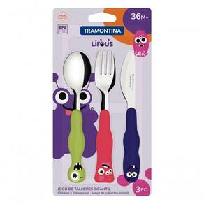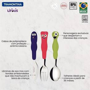 Jogo De Talheres Infantil Tramontina Lirous 3 Peças Colorido Com o jogo de talheres infantil Tramontina Lirous colorido 03 peças vai agregar muito maior autonomia e diversão para a refeição das crianças. Produzidos com lâminas em aço inox e cabos de polipropileno, os talheres são resistentes e permitem que as crianças os manuseiem sem perigo. Eles ainda contam com proteção antimicrobiana que inibe o crescimento de fungos e bactérias por toda a vida útil do produto. Eles ainda podem ser lavados na máquina de lavar louças, deixando a sua rotina, muito mais prática! Recomendações de Uso: Recomenda-se o uso destes produtos para crianças com 12 meses ou cuidado ao manusear o garfo por ser produto da primeira utilização, lave bem as peças e produtos podem ir à máquina de lavar, porém não recomendamos usar produtos abrasivos como saponáceos, esponjas rígidas ou palhas de aço. Seque-os bem antes de descarte dos produtos e embalagem siga as orientações de reciclagem ção: Por razões de e saúde do seu filho, utilizar sempre os produtos com supervisão de um adulto. Não utilize os produtos caso apresentarem dano ou . Verifique sempre a temperatura do alimento antes da alimentação. Informações Adicionais: