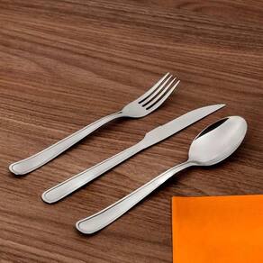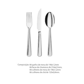 Detalhes do conjunto: 06 Garfos de mesa – 196 x 1,2 mm, 06 Facas de churrasco – 216 x 2,5 mm, 06 Colheres de mesa – 196 x 1,2 mm e 06 Colheres de chá – 120 x 0,8 mm