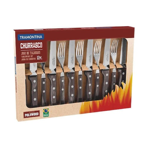Jogo de Talheres para Churrasco 12 Peças Jumbo Polywood Tramontina O churrasqueiro é sempre o último a sentar à mesa. Mas para garantir que os convidados também tratem o assado com respeito, nada melhor do que escolher os talheres certos para isso. A linha Churrasco da Tramontina tem cabos de madeira, que resistem ao tempo e à umidade, e lâminas em aço inox para garantir o corte perfeito das carnes. Lâminas de aço inox. Cabos de madeira tratada Polywood. Rebites de alumínio. Composição 6 Garfo mesa inox polywood 6 Faca churrasco jumbo inox 5 polywo