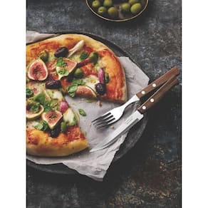 Lâminas de aço inox. As lâminas das facas têm maior durabilidade do fio devido ao tratamento térmico. As lâminas dos garfos contam com maior espessura e uma estampagem do aço que garante maior resistência, evitando deformações. Os cabos são de madeira natural. Rebites de alumínio.