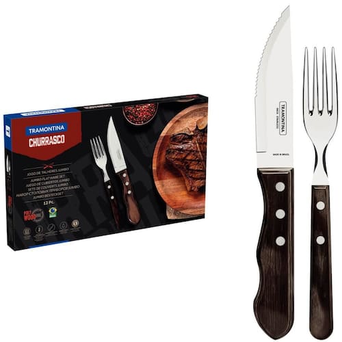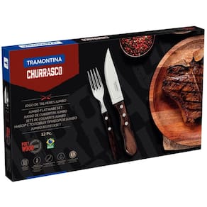 Jogo de Talheres para Churrasco Jumbo Tramontina 12 Peças em Aço Inox Cabo Castanho Polywood.