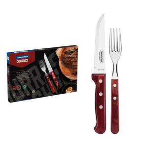 O churrasco na sua casa vai atingir um nível superior com o jogo de talheres jumbo Tramontina Churrasco com lâminas em aço inox e cabos de madeira tratada polywood vermelho 12 Peças. São 12 peças perfeitas para serem usadas para servir as melhores carnes aos seus convidados. Os cabos de madeira tratada Polywood garantem mais resistência a impactos e a altas temperaturas. Além disso, levam mais beleza à mesa, devido a sua cor vibrante. Produzidas com lâmina em aço inox, as facas possuem maior durabilidade do fio, pois recebem tratamento térmico. Os garfos contam com lâminas de maior espessura e uma estampagem do aço que garante maior resistência, evitando deformações. São fáceis de limpar, podendo ir à máquina de lavar louças.