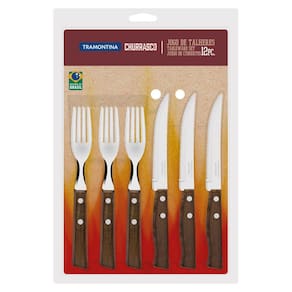 Jogo de Talheres para Churrasco Tramontina em Aço Inox com Cabo de Madeira Natural 12 Peças O seu churrasco ficará ainda mais completo com o Jogo de Talheres para Churrasco Tramontina em Aço Inox com Cabo de Madeira Natural 12 Peças da linha Churrasco. Com peças pensadas especialmente para esse ritual tão saboroso, o jogo conta com facas e garfos com lâminas em aço inox, sendo altamente durável. Além disso, possui cabos em madeira natural. As facas irão garantir aquele corte perfeito, permitindo apreciar ainda mais a carne, ou seja, o seu churrasco será um sucesso. Informações Gerais Lâminas de aço inox. As lâminas das facas têm maior durabilidade do fio devido ao tratamento térmico. As lâminas dos garfos contam com maior espessura e uma estampagem do aço que garante maior resistência, evitando deformações. Os cabos são de madeira natural. Rebites de alumínio. Recomendações de Uso Antes da primeira utilização, lave bem as peças e seque-as. Tenha cuidado ao manusear produtos cortantes e perfurantes e mantenha-os fora do alcance de crianças. Para maior durabilidade dos produtos, recomenda-se secar bem antes de guardar. Para descarte dos produtos e embalagens siga as orientações de reciclagem vigentes.