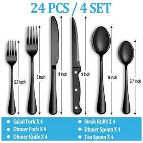 Especificações: Número de Peças: 24, Material: Aço Inoxidável, Cor: Preto, Instruções de Cuidado com o Produto: Lavável na Máquina de Lavar Louça, Usos Recomendados para o Produto: Internos, Característica Especial: Resistente à Ferrugem e Corrosão, Tipo de Acabamento: Polido, Componentes Incluídos: 4 Facas de Jantar, 4 Facas de Churrasco, 4 Garfos de Jantar, 4 Colheres de Jantar, 4 Garfos de Salada/Sobremesa, 4 Colheres de Sobremesa/Chá Peso:3 kg Marca: Não Informado