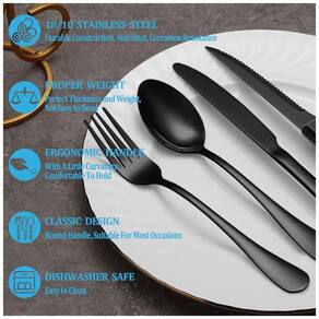 Este conjunto de talheres preto é essencial para famílias ou restaurantes, contendo 4 facas de jantar, 4 facas de churrasco, 4 garfos de jantar, 4 colheres de jantar, 4 garfos de salada/sobremesa e 4 colheres de sobremesa/cha´. Feito de aço inoxidável de alta qualidade, é durável, resistente à ferrugem e corrosão, livre de BPA e não deixa gosto metálico. Com um visual único em preto, proporciona um ambiente luxuoso e elegante. Suas alças ergonômicas garantem conforto e segurança durante o uso. Cuidados fáceis: lavar à mão e secar antes de guardar.