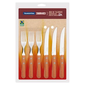 Jogo de Talheres Tramontina Churrasco com Lâminas em Aço Inox e Cabos de Madeira Natural 12 Peças O Jogo de Talheres Tramontina Churrasco com Lâminas em Aço Inox e Cabos de Madeira Natural 12 Peças é a escolha perfeita para garantir durabilidade e conforto para os encontros. São 12 peças produzidas com cabo de madeira natural e rebites de alumínio, as lâminas das peças são em aço inox e possuem características que as tornam a melhor escolha para servir à mesa. As facas têm maior durabilidade do fio devido ao tratamento térmico e os garfos contam com lâminas com maior espessura e uma estampagem do aço que garante maior resistência. São itens que garantem bom gosto e sofisticação para servir os amigos. Informações Gerais Lâminas de aço inox. As lâminas das facas têm maior durabilidade do fio devido ao tratamento térmico. As lâminas dos garfos conta com maior espessura e uma estampagem do aço que garante maior resistência, evitando deformações. Os cabos são de madeira natural. Rebites de alumínio.