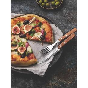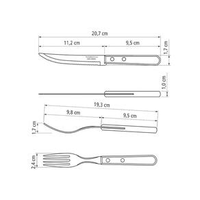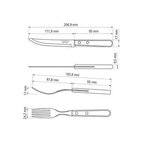 Lâminas de aço inox. As lâminas das facas têm maior durabilidade do fio devido ao tratamento térmico. As lâminas dos garfos conta com maior espessura e uma estampagem do aço que garante maior resistência, evitando deformações. Os cabos são de madeira natural. Rebites de alumínio.
