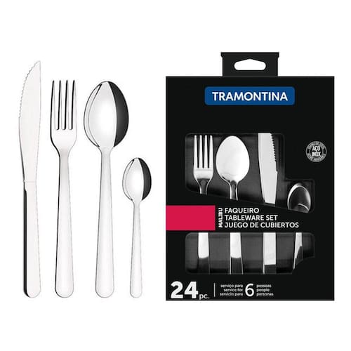 Pequenos cuidados com seu lar fazem toda a diferença. #Faqueiro Tramontina 24 Peças #Facas com Excelente Corte #Faqueiro Aço Inox Garantia: 90 dias / Peso: 590g / Cor: Inox / Ref: 23798046 Dimensões das Facas: 20,5cm (C) x 1,5cm (L) Dimensões dos Garfos: 18,5cm (C) x 2,5cm (L) Dimensões das Colheres de Mesa: 18,5cm (C) x 4cm (L) Dimensões das Colheres de Café: 12,5cm (C) x 2,5cm (L) Facas: possuem têmpera de excelente qualidade, garantindo bom corte e grande retenção de fio. Cuidados: Não lavar com materiais abrasivos. Conteúdo: - 6 Facas para Churrasco 4"; - 6 Garfos de Mesa; - 6 Colheres de Mesa; - 6 Colheres para Chá. Material: - Aço Inox: Material altamente resistente à ferrugem mantém o fio por muito tempo e possui grande durabilidade. Este faqueiro de 24 peças irá compor sua mesa deixando-a mais bonita e elegante, podendo ser utilizado tanto para refeições rotineiras quanto para os momentos especiais. Um faqueiro totalmente produzido em aço inox que oferece durabilidade e resistência, além de deixar sua mesa muito mais elegante e cheia de estilo, pois suas peças contam com um acabamento que tornam o talher ainda mais especial. Muito fáceis de limpar, o jogo de talheres Tramontina pode ir à máquina de lavar louças e serve até 6 pessoas.
