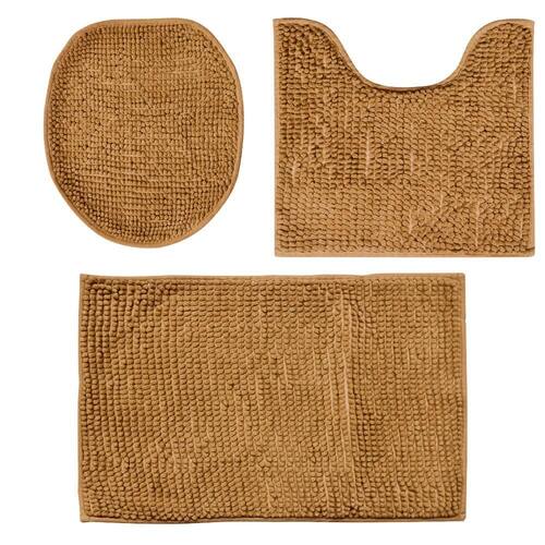 Composto por três peças, o conjunto inclui um tapete em U de 40x40cm, perfeito para a base do vaso sanitário, um tapete retangular de 40cm de largura e 60cm de comprimento, ideal para a frente da pia ou do box, e um tapete oval com elástico de 40cm de largura e 45cm de comprimento, que pode ser utilizado na tampa do vaso sanitário ou complemento em qualquer área do banheiro.
