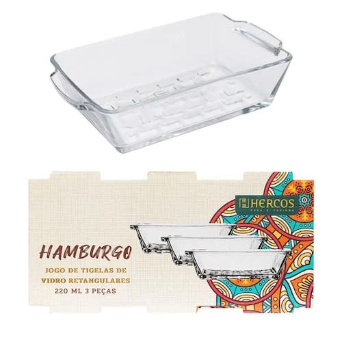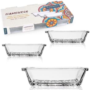 Informações Técnicas: - Marca: Hercos - Modelo: Hamburgo H186 - Material: Vidro - Cor: Transparente - Capacidade: 220 ml (cada tigela) - Dimensões da tigela: 14,5 x 9,5 x 4,50 cm - Quantidade: 3 peças - Uso: Vai ao micro-ondas e lava-louças - Acabamento: Liso - Formato: Retangular