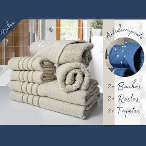 Resumo do Jogo de Toalha 2 Banho 2 Rosto 2 Tapetes - 6 pçs Luxo MontrealComposição - 2 Toalhas de Banho + 2 Toalhas de Rosto + 2 Tapetes antiderrapanteGramatura - 330 G/m Peso Toalha de Banho - 290 a 300 Gramas Peso Toalha de Rosto - 110 a 120 GramassTamanho Toalha de Banho - 70x130 cm Tamanho Toalha de Rosto - 45x70 cm Fio - 16/1