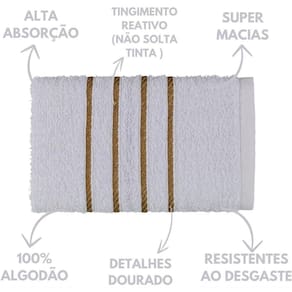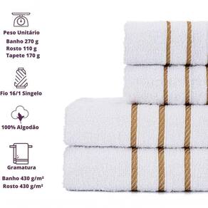 Jogo De Toalha 2 Banho + 2 Rosto Montreal 100% Algodão Alta Absorção - Branco Jogo de Toalha 2 Banho 2 Rosto - 4 Peças da Coleção Montreal 100% Algodão Alta Absorção Sobre as Toalhas: Composição - 2 Toalhas de Banho + 2 Toalhas de RostoGramatura - 330 G/mPeso Toalha de Banho - 290 a 300 GramasPeso Toalha de Rosto - 110 a 120 GramasTamanho Toalha de Banho - 70x130 cmTamanho Toalha de Rosto - 45x70 cmFio - 16/1 QUALIDADE MONTREAL As Toalhas Montreal são confeccionadas com 100% algodão, tendo alta absorção de água desde a ira vez de uso. São indicadas para uso no Dia a Dia, Pousada, Estética, Praia, Spas, Hoteis e Moteis. Feito com fio 16/1 singelo um dos melhores fios para produção de toalhas tornando-as mais macias e com alta durabilidade nas lavagens industriais.O tingimento é reativo deixando a Toalha Montreal com cores modernas e vivas, por ser reativo não tem o risco de soltar tinta. Essa toalha contém a barra decorada em dourado para dar um toque de modernidade e luxo ao seu Ambiente.A Toalha Montreal é desenvolvida com os melhores fios para dar macies a seu corpo, tingidas em cores fortes e alegres para deixar seu ambiente mais aconchegante e agradável. Pode comprar a sua toalha tranquilamente, temos a certeza que você vai gostar, será um grande prazer lhe atender!Ideal para pessoas que buscam qualidade e resistência, com toalha macia e com ótima absorção. Compre este Kit Montreal de presente e surpreenda quem você ama!