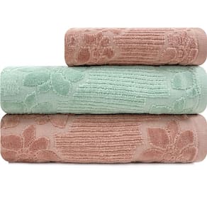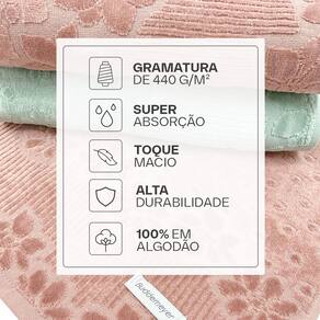 De um lado, apresentam textura atoalhada; do outro, acabamento aveludado com toque sedoso — ambos com super absorção. O design moderno combina acabamento em jacquard com estampas em relevo por toda a peça e barrado com detalhes florais.