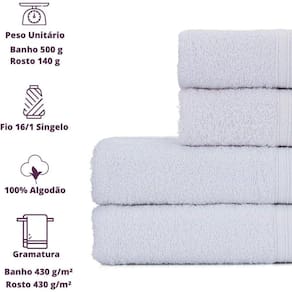 Conteúdo: Jogo com 4 peças - 2 Banho 2 RostoGramatura: 430 g/mPeso Aproximado da Toalha de Banho: 490 a 510 GramasPeso Aproximado da Toalha de Rosto: 160 a 180 GramasTamanho da Toalha de Banho: 80x150 cmTamanho da Toalha de Rosto: 45x80 cmColeção: Itália SoftFio: 16/1 SingeloMaterial: 100% Algodão
