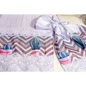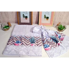 Toalhas felpuda aveludada, da marca Brutextil, na cor branca, com barrado digital, com estampa de cactos , em tons de azul ,verde, bege e branco, detalhes em guipir e laise na cor branco e fitas na cor cinza.