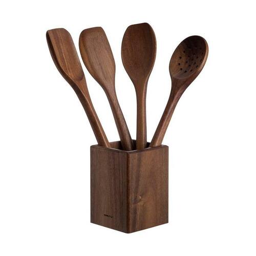 O Jogo de Utensílios Acácia Square possui 5 peças fabricadas 100% em madeira acácia, ideal para manipular alimentos em panelas antiaderentes, pois não causa riscos. Vem com um suporte que acomoda os utensílios.