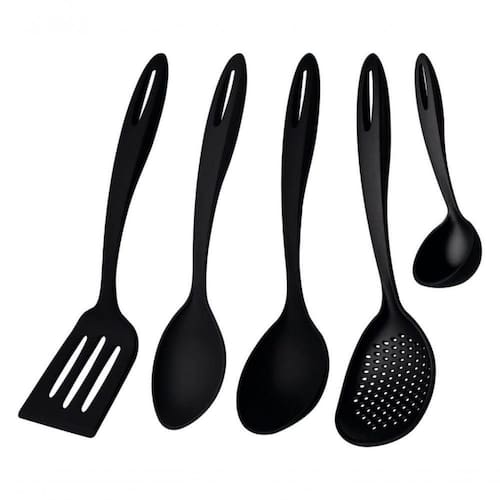 Utensílios de Nylon que permite uso em temperaturas de até 180 C. Os cabos possuem furo passante possibilitando que sejam pendurado na sua cozinha. Utensílios ideais para uso em panelas com revestimentos antiaderentes e cerâmicos, pois não danifica o produto. Podem ir à máquina de lavar louças facilitando seu dia a dia.