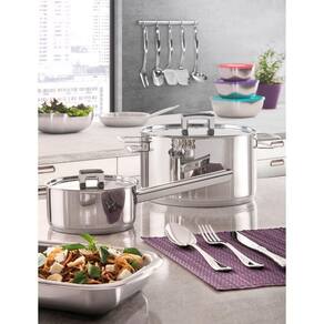 O Jogo de Utensílios Tramontina em Aço Inox com Suporte de Parede 5 Peças da Linha Extrata são os utilitários da Tramontina que também são objetos de decoração. Com um design moderno e charmoso, são produzidos em aço inox, altamente duráveis e resistentes. São 5 peças com furo no cabo que podem ser incluídas na decoração da sua cozinha. Fáceis de manusear e limpar, podem ser lavados diariamente na máquina de lavar louças.