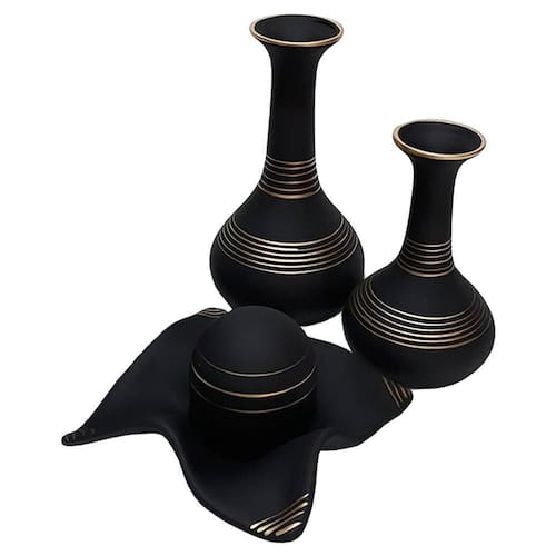 Jogo de vasos par long pipe e centro de mesa fosca - black gold Jogo de vasos par long pipe e centro de mesa em cerâmica fosca premium decor Jogo de vasos centro de mesa 1 com par de vasos long pipe cano longo premium em cerâmica fosca decorativa de alta qualidade e durabilidade com acabamento diferenciado, inspirador e moderno. O produto em cerâmica é uma belíssima peça atemporal, sendo ótimo para entusiastas e profissionais da decoração, pois garante charme, elegância, modernidade e sofisticação. Repagine e decore a sua casa, cozinha, sala de jantar, sala de estar, aparadores e mesas em gerais, deixando-as com um clima agradável, alegre e descontraído, sendo também uma ótima opção de presente. Dimensões: - centro de mesa 1 : largura: 20 cm x diâmetro: 12 cm. - vaso long pipe grande: altura: 26 cm x largura: 10 cm. - vaso long pipe médio: altura: 15 cm x largura: 8 cm. Características do produto: - par de vasos long pipe e centro de mesa em cerâmica fosca de alta qualidade e durabilidade - pintura artesanal. - produzido por artesões profissionais seguindo um padrão de qualidade que atenda o gosto dos nossos clientes Cuidados: - recomendamos o uso de pano levemente umedecido para sua limpeza. do produto: - o produto é muito bem acomodado dentro da caixa, e super embalado para evitar quebras, ainda assim possuímos um sistema de e troca. Imagens meramente ilustrativas - produto artesanal, podendo variar de cor e/ou tonalidade