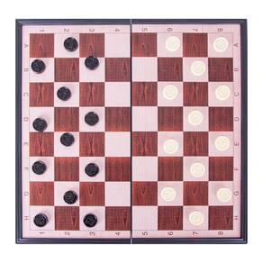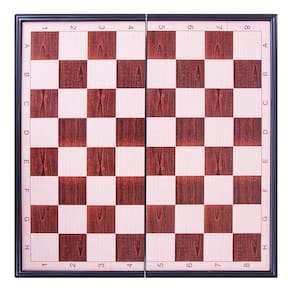 Tabuleiro em plástico 30 x 30 cm, 16 peças claras e 16 escuras de plástico com imã na base. Tabuleiro dobrável com superfície metálica, nas bordas possui marcação numérica na vertical e alfabética na horizontal.