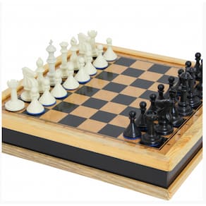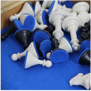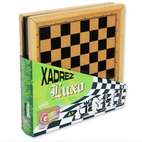 - Estojo/Tabuleiro serigrafado na face externa com tinta atóxica, em quadrantes claros e escuros, com 32 peças para o xadrez (Rei 10cm de altura). Estojo/tabuleiro aberto: 43 x 43 x 8cm.