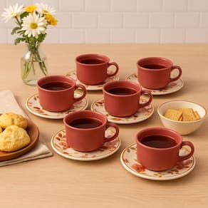 Produzido em cerâmica de alta resistência, o conjunto traz seis xícaras com capacidade perfeita para servir o chá com conforto, acompanhadas de seis pires que completam a experiência com elegância. Seu design delicado é valorizado por detalhes modernos e acabamento refinado, transformando cada encontro em uma ocasião única e acolhedora.